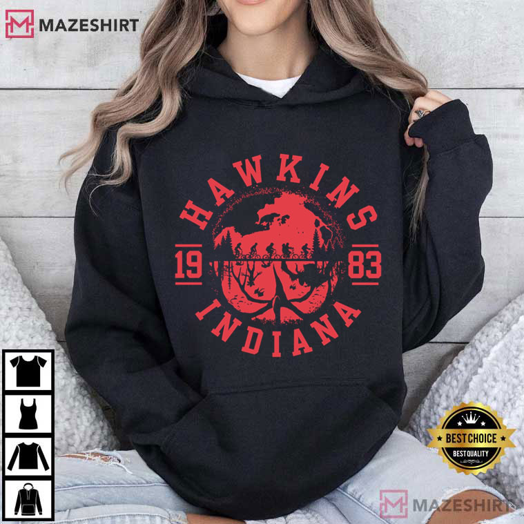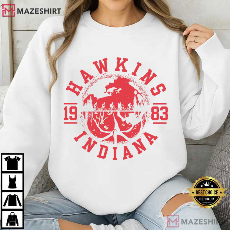 The Hawkins 1983 Indiana Upside Down Movie Lover T-Shirt is for people who know right away that the calm town wasn’t so quiet after all. This shirt looks like something from the past with its strong red-on-black print, but there’s something far more disturbing going on behind it. At first sight, the design looks old-fashioned, yet the further you look, the more you see its darker side.