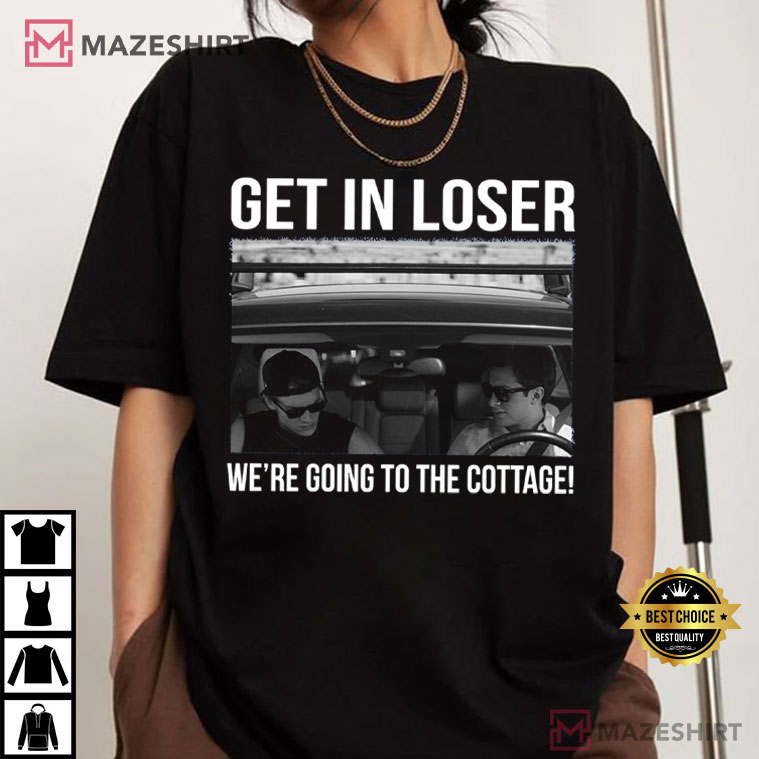 There is a black-and-white, movie-style still shot of two men seated in a car, along with the bold quote “Get In Loser, We’re Going To The Cottage!” The simple style fits the story’s tone: it’s emotionally charged, subtle, and unforgettable. You don’t need names or further information; the shirt’s power comes from being recognized.