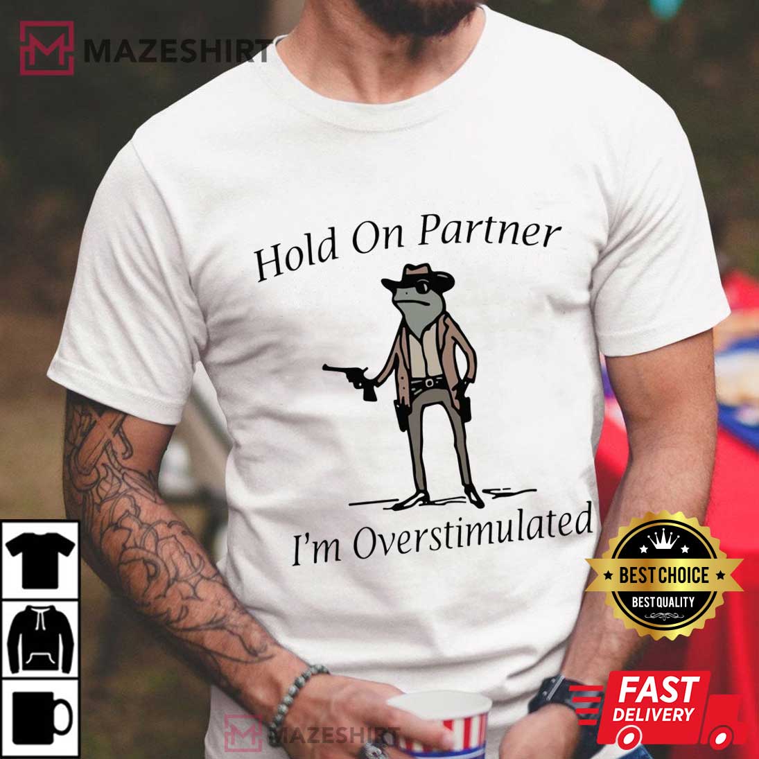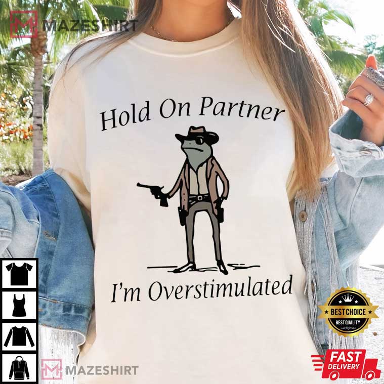 Hey, you! Yes, you who are reading through a lot of online stores and feeling a little overwhelmed by all the options. Take a break, sweetheart. I’ve got the perfect thing to make you laugh and give your clothes a fun boost. “Hold On Partner I’m Overstimulated Cowboy Frog Meme T-Shirt” is a white cotton treasure that is half funny meme, part relatable cry for assistance, and all-around wonderful.