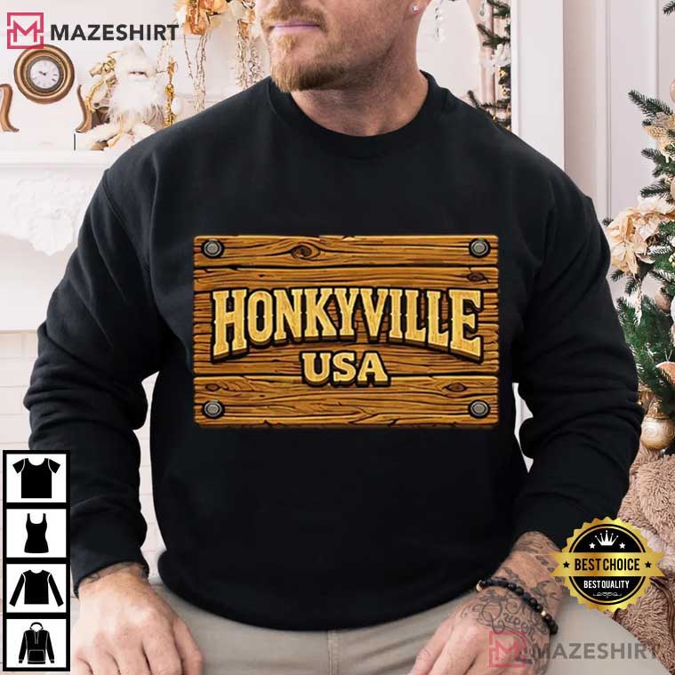 The Honkyville USA Rustic Western Funny Country T-Shirt gives your everyday clothes a relaxed, “boots on the dance floor” feel. This design is based on classic honky-tonk culture and the charm of small-town America. It looks like a sign you would find outside a busy country bar in Texas or Tennessee.