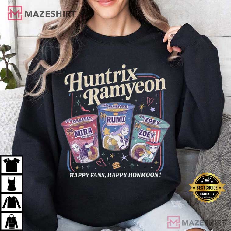 If you appreciate K-pop and the supernatural, the Huntrix Ramyeon Noodle Kpop Demon Hunters Movie Fan Gift T-Shirt is the right shirt for you. Get ready to fight demons and eat noodles! The Huntrix T-Shirt has a vibrant design with three ramyeon cups named “Mira,” “Rumi,” and “Zoey,” each with the attitude of a ferocious K-pop star. Stars and the big “Huntrix Ramyeon” inscription surround the cups. “Happy Fans, Happy Honeymoon!” is a fun expression that makes it sound like a made-up movie in which demon hunters who love noodles marry the hearts of their fans.