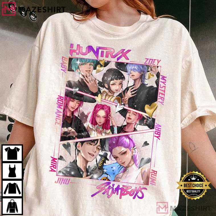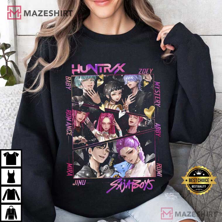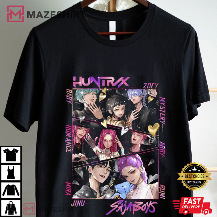 Want to send your favorite K-pop stars and demon hunters in style? The Huntrix T-Shirt with the amazing romantic pairs of Huntrix and Saja Boys is ready to steal your heart and your clothes! This Couple Ship T-Shirt isn’t just a piece of clothing; it’s a love letter to fandom. It’s great for giving to a buddy who loves their OTP or showing off your own shipper passion. This Kpop Demon Hunters Merch came out at the same time as the animated movie Kpop Demon Hunters on Netflix in June 2025. It highlights the hot chemistry between the Huntrix females (Rumi, Mira, and Zoey) and the Saja Boys (Jinu, Mystery, Romance, Baby, and Abby). This Demon Hunter Fashion piece is a must-have since it has a striking black foundation and a bright, heart-filled design.