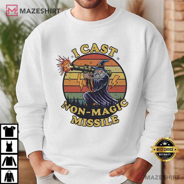 This I Cast Non-Magic Missile T-Shirt is a great addition to your collection if you like tabletop RPG jokes, crazy wizard energy, or memes from the internet. The design shows a conventional wizard with a robe, cap, and long beard, but instead of performing a spell, he’s firing a “non-magic missile” in a funny way that makes it look like a bomb. The retro sunset background gives the image an old-school fantasy-meets-80s look that helps it stand out.