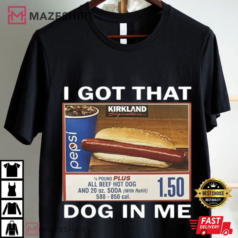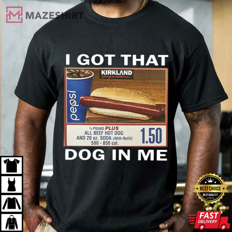 Hey, meme lords and snack lovers! This shirt is practically your new uniform if you’ve ever eaten a Costco hot dog and felt like a champion afterward. Imagine a sleek black tee (or any color you like) with the words “I GOT THAT DOG IN ME” written in big white letters above a retro-style picture of the famous Kirkland Signature hot dog combo. It comes with a juicy 1/4-pound all-beef frank, a frosty 20-oz. Pepsi soda (with a refill, because why not?), and the unbeatable price of $1.50. It’s not just clothes; it’s a funny badge of pride for anyone who has ever faced the masses at the warehouse to get food court glory.