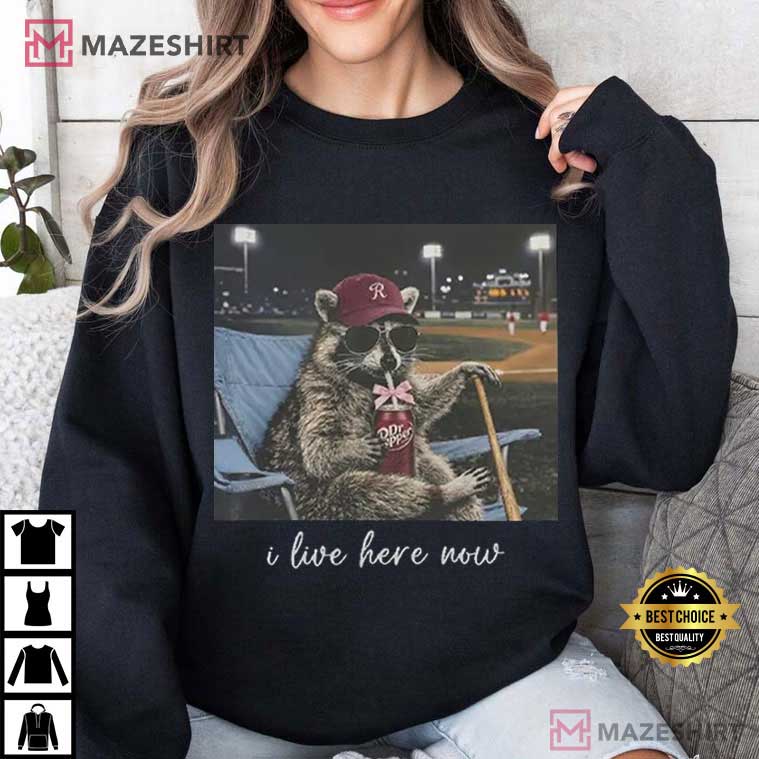 I Live Here Now Funny Raccoon Ballfield Dark T-Shirt