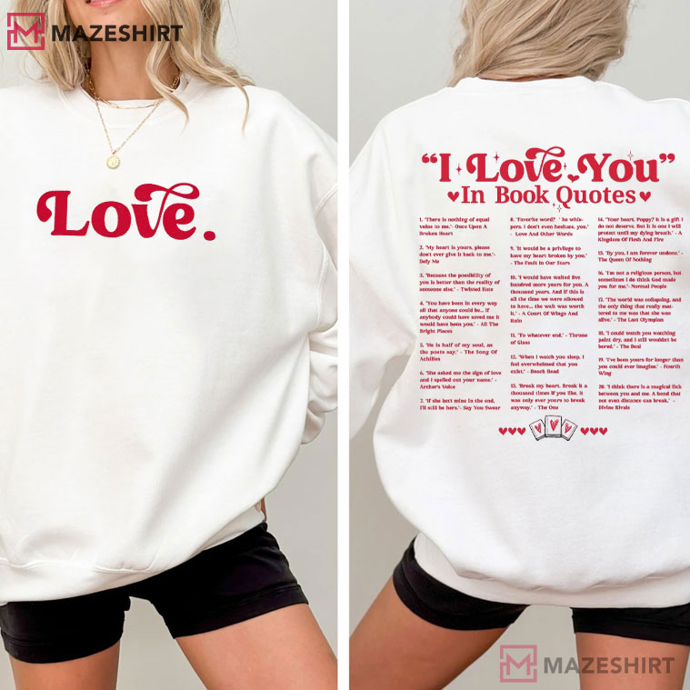 The intricate back design has a carefully chosen collage of iconic “I love you” quotes from popular books and genres. These quotes highlight the heart-fluttering, slow-burn, soul-wrecking moments that book fans remember long after they’ve read the last page. This shirt conveys the sense of being fully lost in words, whether you like fantasy romance, modern fiction, or classic tear-jerkers.