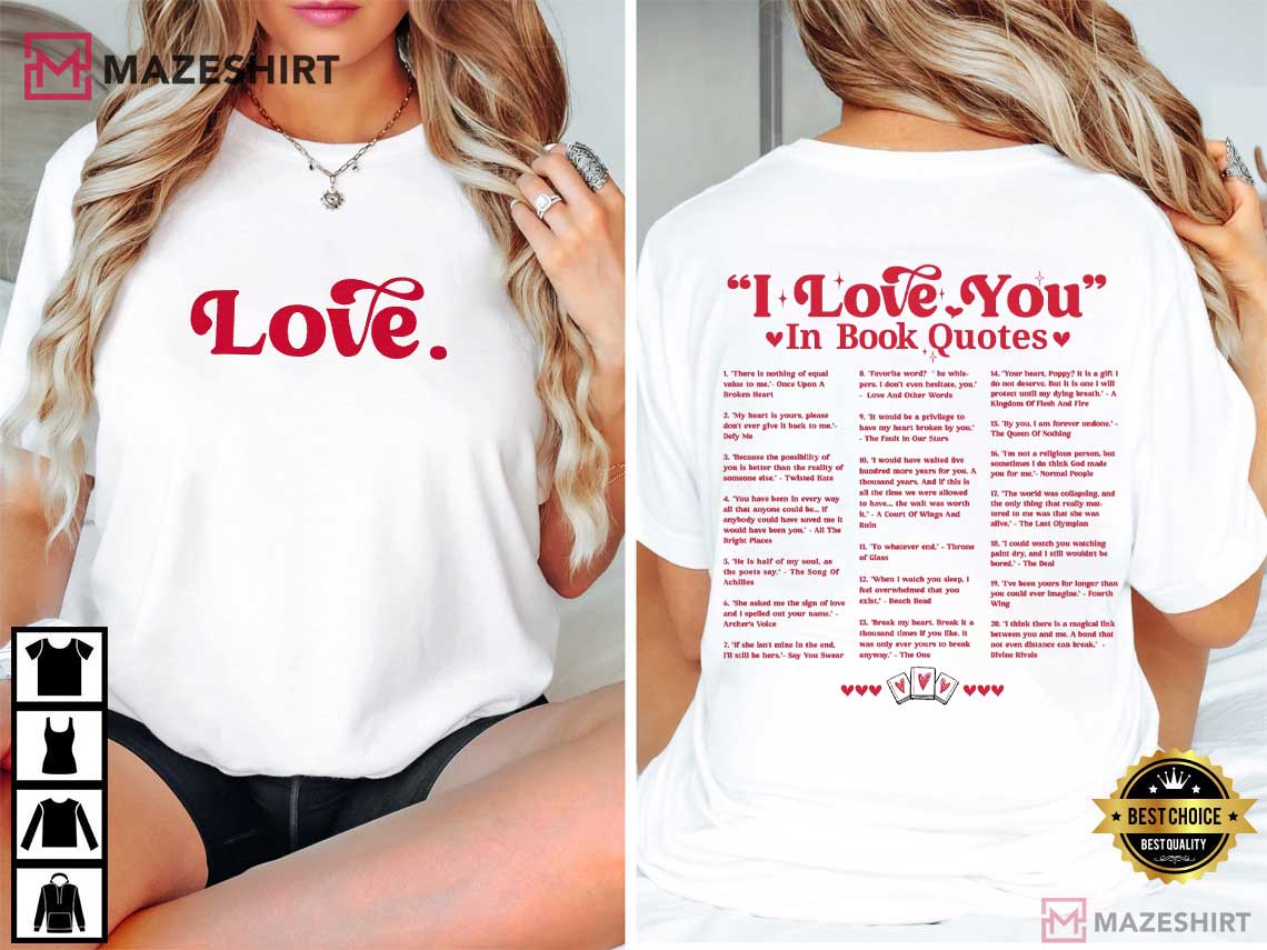 This I Love You In Book Quotes Bookish Graphic T-Shirt is for people who love phrases as much as they love characters. The front is modest, with only one word—Love—printed in a gentle, romantic font. But the true brilliance is on the back.