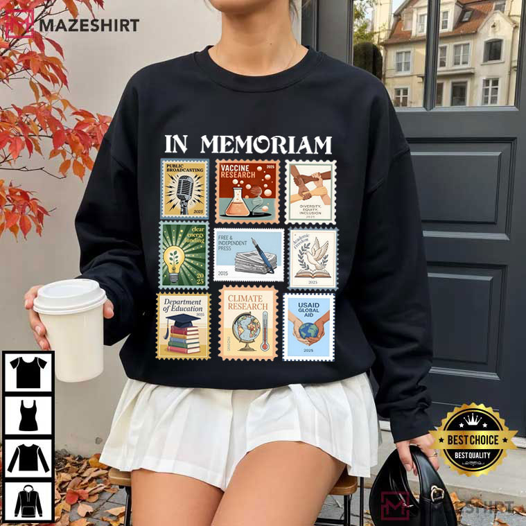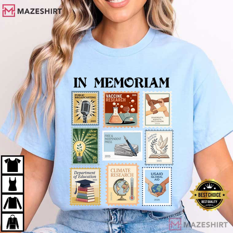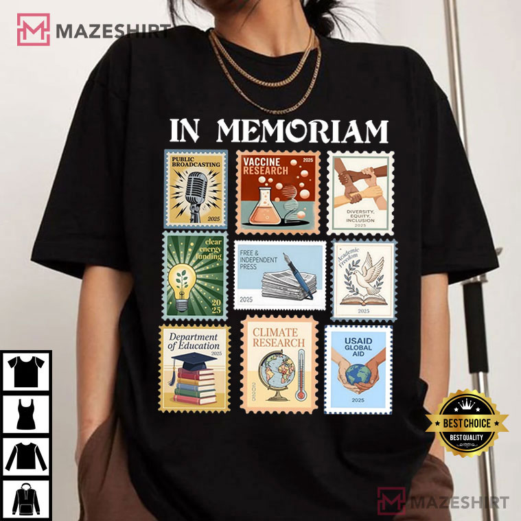 The In Memoriam Pro Democracy Anti Fascism T-Shirt is for people who care about civic principles. It is bold, thoughtful, and full of meaning. This graphic tee has a vintage stamp-style collage with the strong slogan “IN MEMORIAM.” It is both a statement and a reflection, recognizing institutions and ideas that many people think should be protected and preserved.