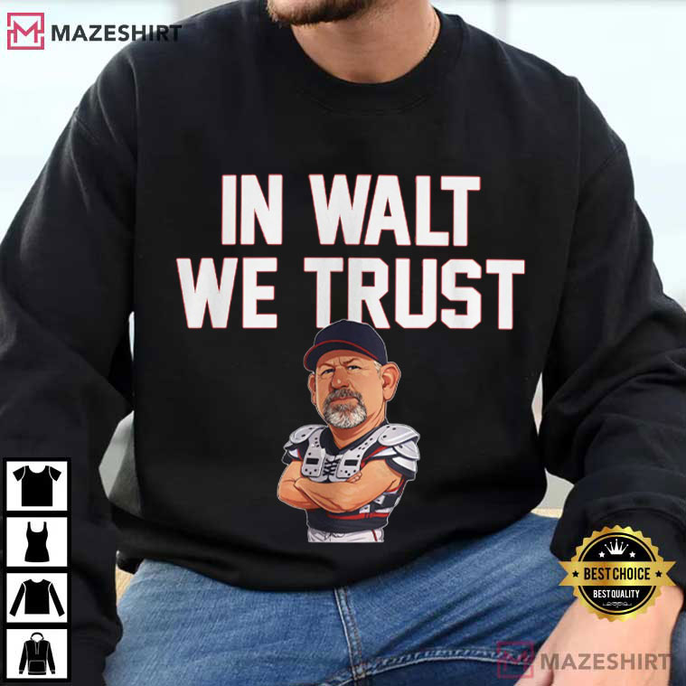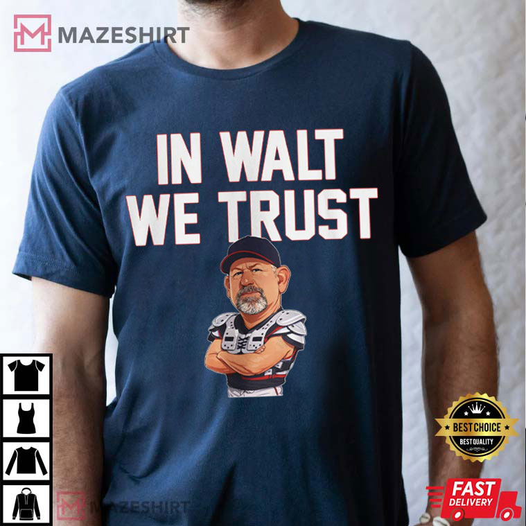 The words “IN WALT WE TRUST” is right in the middle of this shirt, along with a cartoon-style coach figure in full catcher gear. Only serious baseball fans will get how funny and respectful it is.