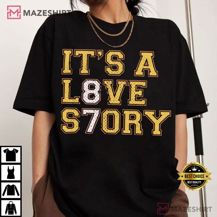 Hey, other people who like epic love stories and touchdown dances! If you’ve been riveted to your screen watching Taylor Swift cheer on Travis Kelce from the VIP box or sing “Love Story” while envisioning it blended with football cries, get ready. The It’s a Love Story 87 The Taylor and Travis Footballs Power Couple T-Shirt is here to let you wear that magic. Imagine a sleek black shirt with big, varsity-style letters that say “IT’S A L8VE ST7RY.” The 8 and 7 are cleverly combined to honor Travis’s famous jersey number, 87.
