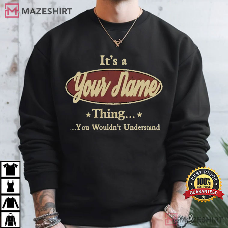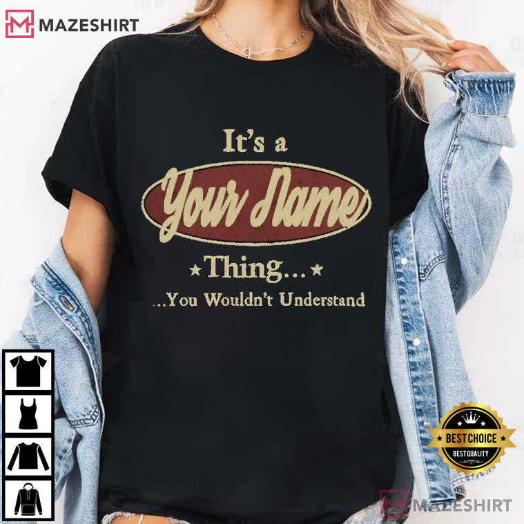 The “It’s a Your Name Thing, You Wouldn’t Understand” Anyone can make a colorful, retro-style design out of their name with Custom T-Shirt. The design has a retro badge layout and aged, weathered lettering that seems like it originated from an old diner sign or a classic Americana brand. The “Your Name” part lets you personalize the tee. You can put your own name, a nickname, a family name, or an inside joke in there, and it will be yours right away.
