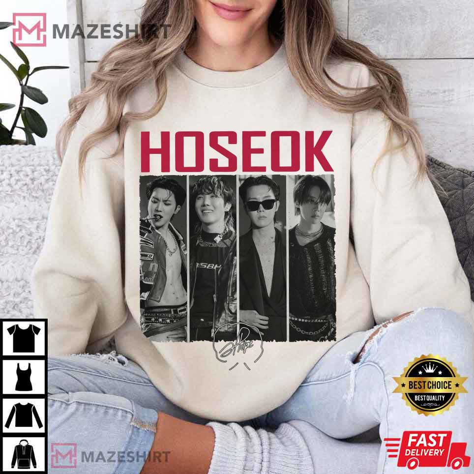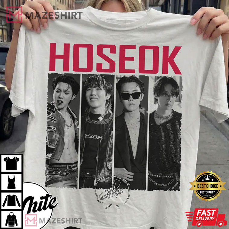 J-Hope (Hoseok) is the BTS member who most represents pure energy and artistic growth. This J Hope Hoseok BTS Boy Band Fan Merch T-Shirt perfectly portrays that mentality. This shirt has a bold, performance-inspired collage on it that shows off all the sides of Hoseok, from his explosive stage presence to his calm off-stage style.