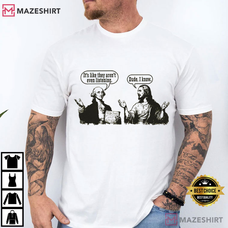 The Jesus and George Washington Funny Political Christian T-Shirt is a great joke that combines history, faith, and modern irony. The design shows George Washington and Jesus Christ facing each other in a classic black-and-white style, with speech bubbles. Washington says, “It’s like they’re not even listening,” and Jesus replies, “Dude, I know.” The humor is subtle, easy to understand, and easy to spot.