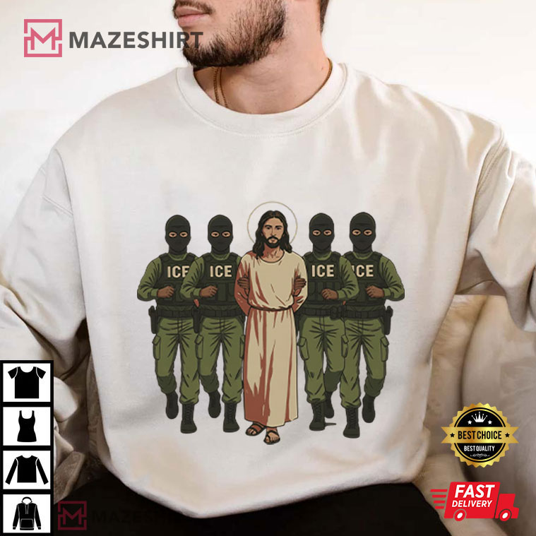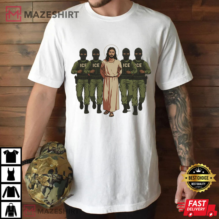 This Jesus Arrested Parody Anti ICE Political Protest T-Shirt makes a strong visual message that makes people stop and think. The design takes a well-known biblical scene and gives it a modern twist: Jesus walks calmly and determinedly forward while masked ICE officers surround him. The difference is on purpose, and it’s disturbing. It offers a simple yet deep question: Who would be arrested today for preaching love, mercy, and compassion?