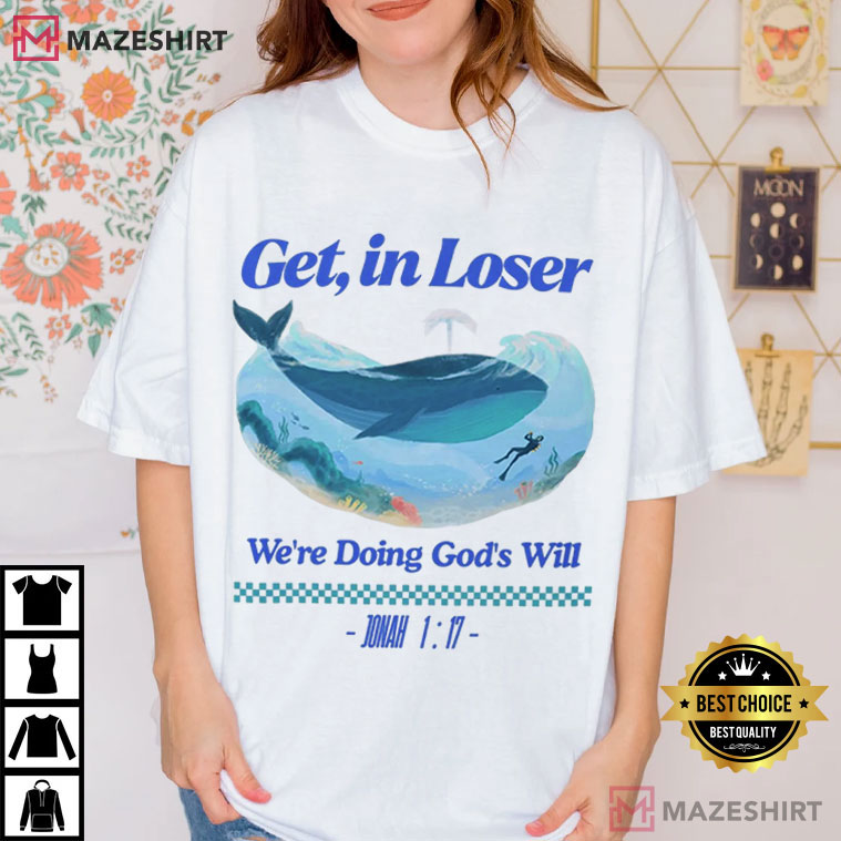 The Jesus Bible Get In Loser We’re Doing God’s Will Whale Shark T-Shirt is the right mix of faith, stories, and modern humor. This shirt is for Christians who like to be creative and funny. It turns a powerful scene from the Bible into a piece of wearable art that looks great and starts conversations. It seems playful on the outside, but it is based on the Bible.