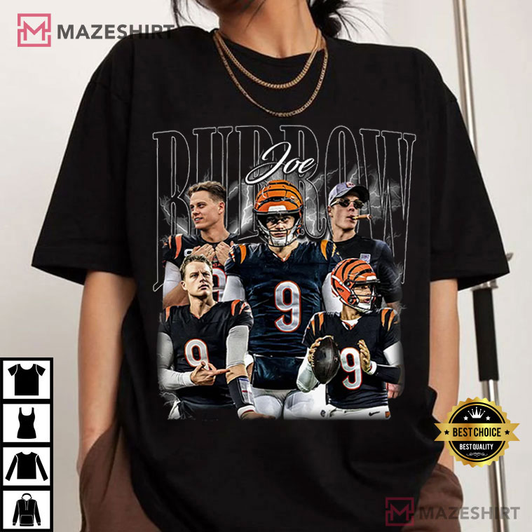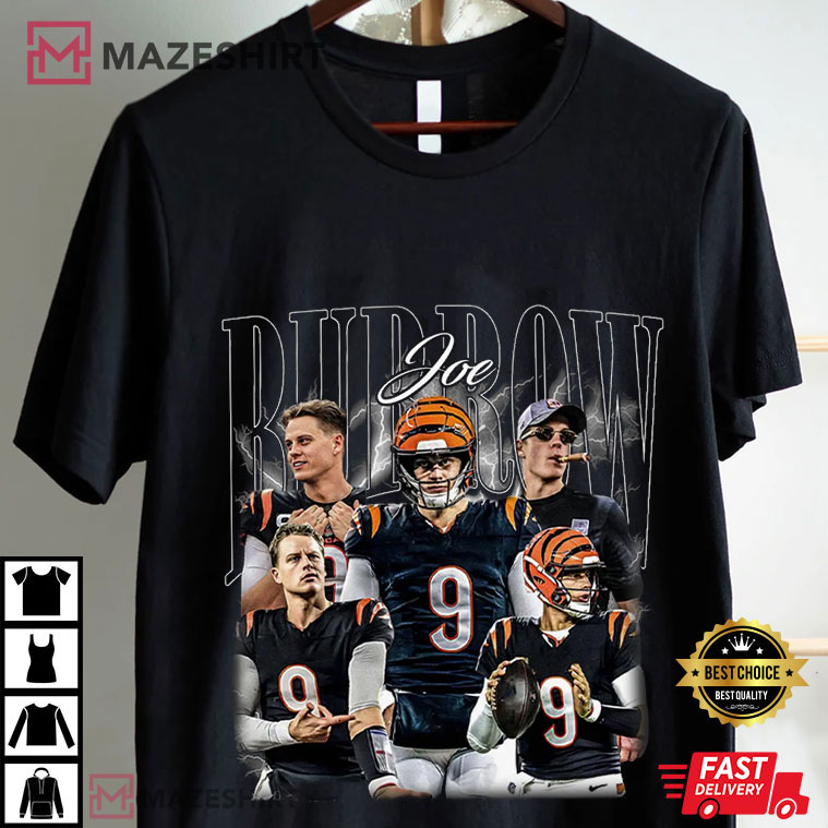 This black tee shows Burrow in action wearing his famous #9 jersey is great for NFL fans, game days, or showing off your Bengals fandom at the next tailgate. Wear it with pride, or use it to scare off your enemies while you eat chili!