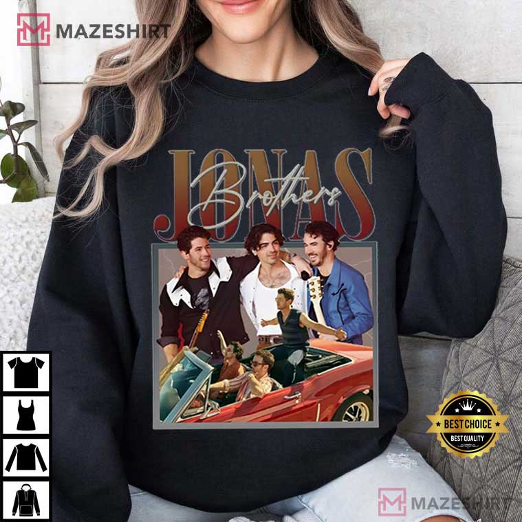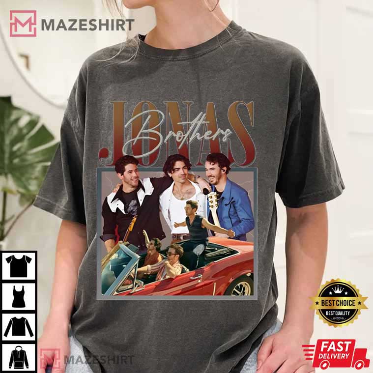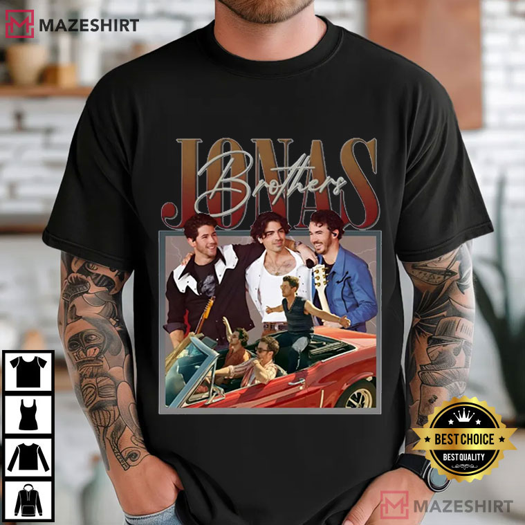 Hey, JoBro lovers! If you’re still playing “S.O.S.” over and over and over again and dreaming about those amazing concert feelings, be ready for the Jonas Brothers Band Reunion Retro 90s Concert Tour T-Shirt to take you on a trip down memory lane. Picture a sleek black shirt that gives off pure 90s vibes. The Jonas Brothers—Kevin, Joe, and Nick—posed like rockstars in a vintage frame, with Kevin playing guitar, Joe looking stylish without trying, and Nick relaxing in the rear of a classic red convertible.