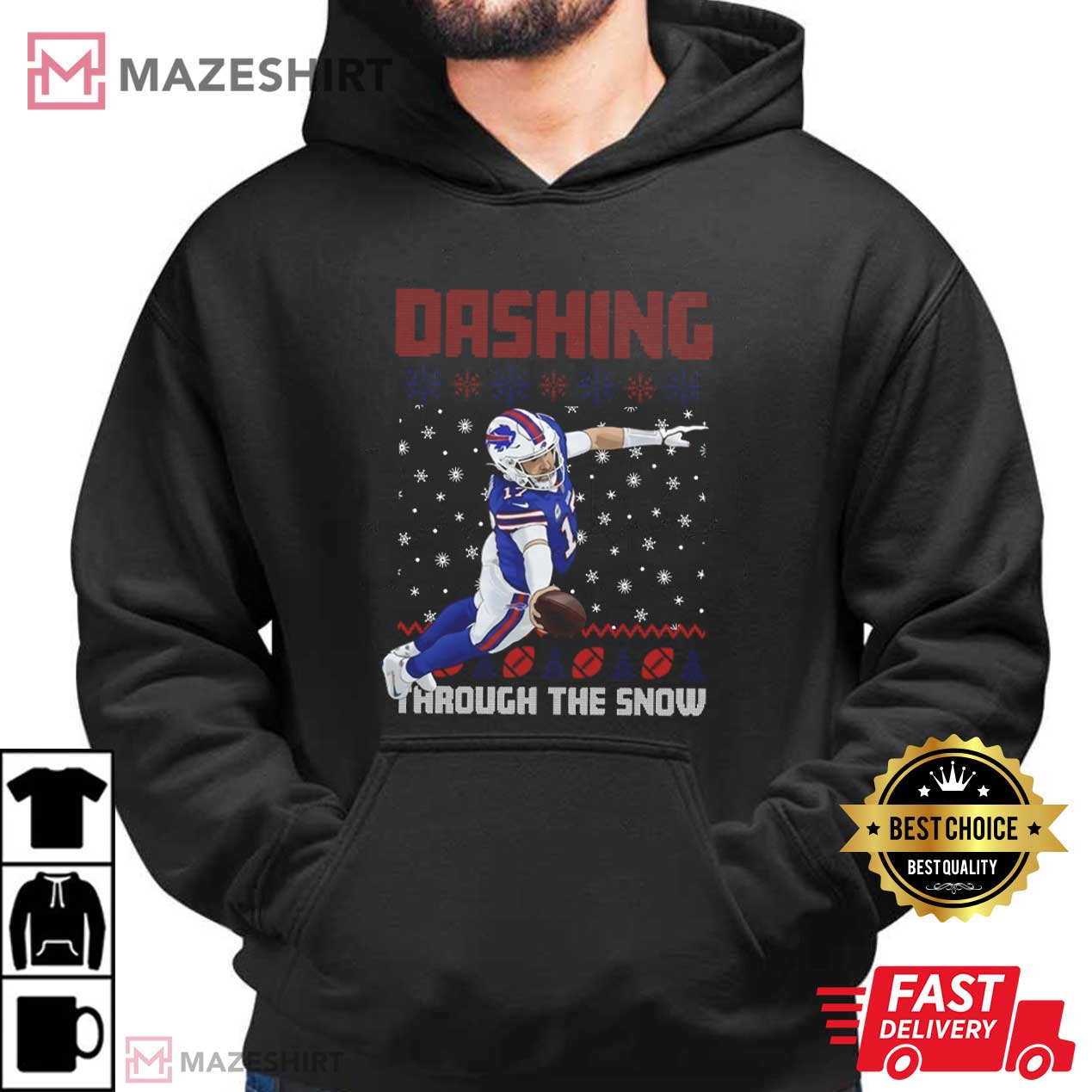Josh Allen Dashing Through The Snow Christmas Football T-Shirt combines the holiday spirit with one of the most entertaining quarterbacks in the league. The design portrays Josh Allen in action, cutting through falling snow with a football in his grasp. He is surrounded by bright winter patterns and bold typography that looks like old-fashioned Christmas sweaters. The slogan “Dashing Through The Snow” provides a fun twist that links the excitement of football with the joy of the holidays.
