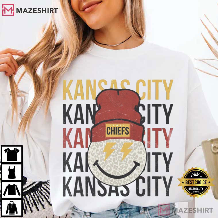 The Kansas City Chiefs Smiley Face Beanie Football Fan T-Shirt is a fun, modern graphic style that shows how much you love your team. This shirt is for fans of the Kansas City Chiefs and is a new twist on fan clothing. It features a lot of Kansas City pride, a streetwear style, and a lot of amusing things.