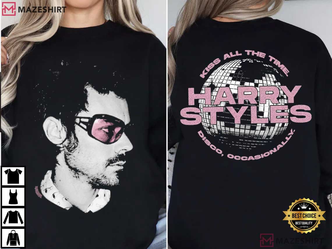 The Kiss All The Time Harry Styles Disco Occasionally Fan T-Shirt is a fun mix of old and new pop culture. This shirt mixes old-school styles with modern fan culture. It’s inspired by Harry Styles’ flamboyant attitude, expressive clothes, and disco-influenced music.