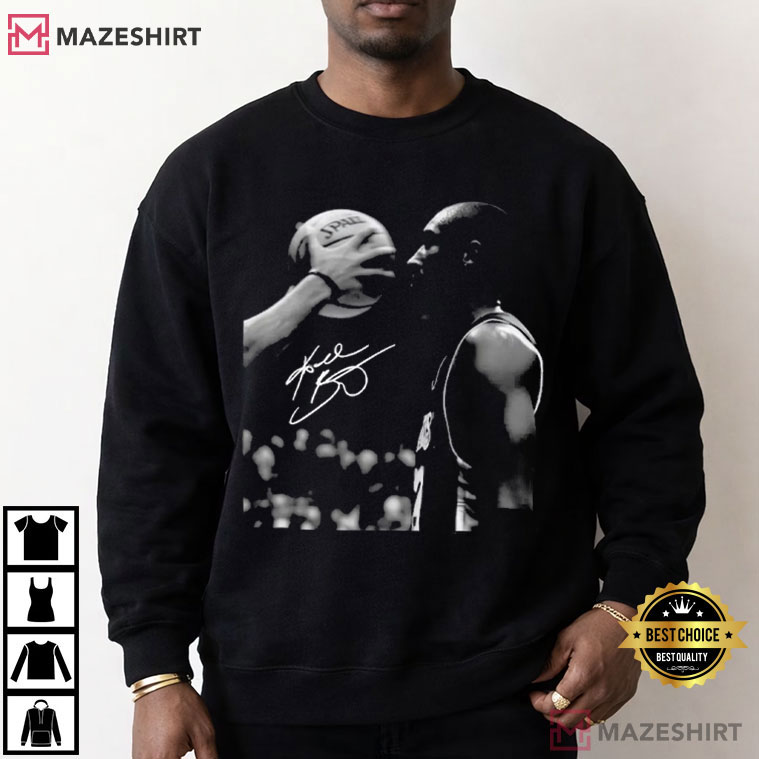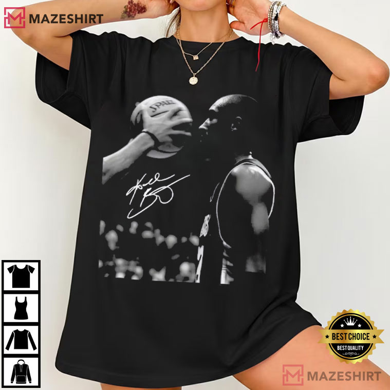 This shirt has a strong black-and-white moment of Kobe Bryant being focused and ready. The picture looks like it came from a movie, like a still from a defining game.