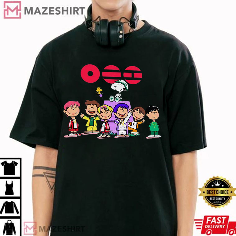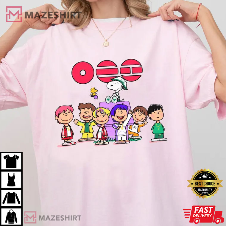 This Kpop BTS Arirang World Tour 2026 Merch T-Shirt is lively, easily identifiable, and full of personality. It feels both new and old at the same time. This design puts BTS in a fun, animated environment that looks like the Peanuts cartoon style. It’s a great piece for ARMY fans that like innovative fan art.
