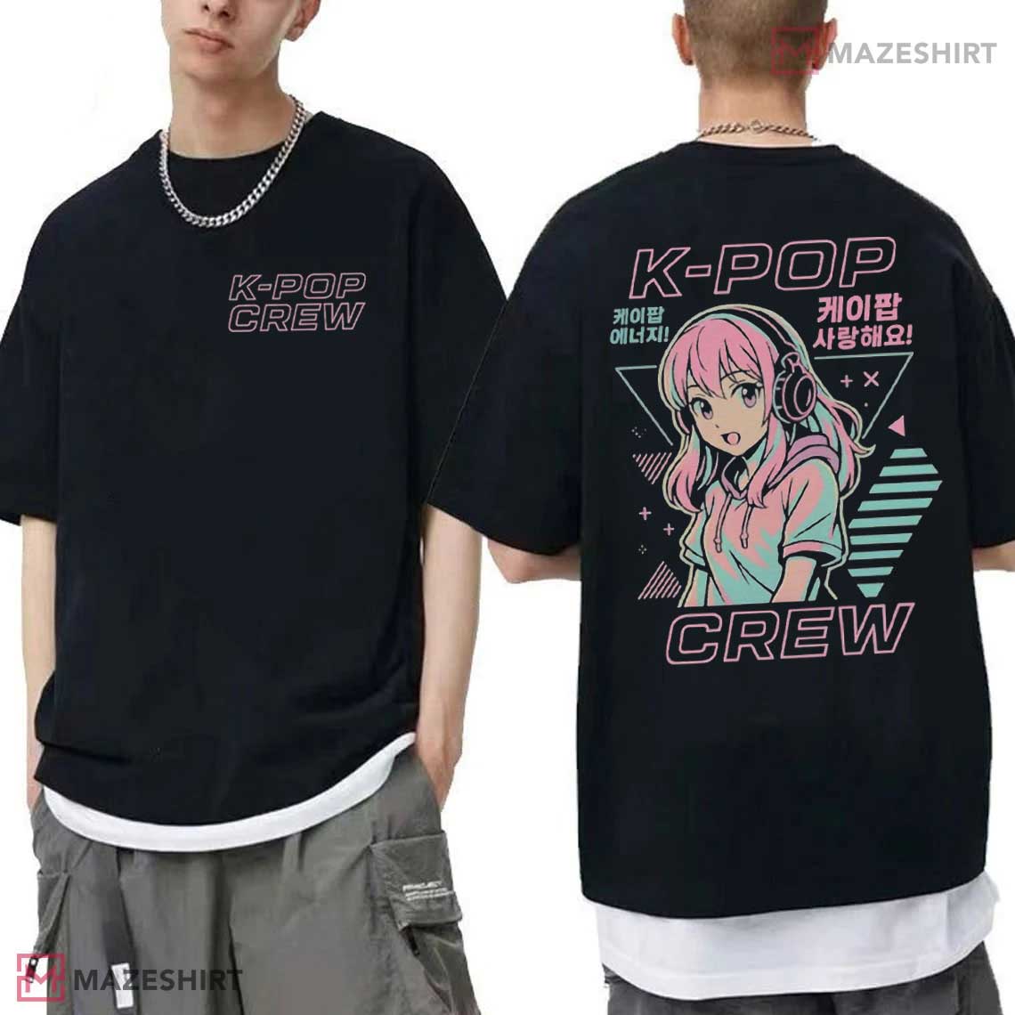 This KPop Crew Bubblegum Girl T-Shirt is the best way to convey that you adore K-Pop or just the look of it. The front has a simple K-POP CREW design, and the back has a bright picture of an anime girl with bubblegum-colored hair and headphones on, surrounded by neon geometric shapes that seem like modern Korean pop visuals.