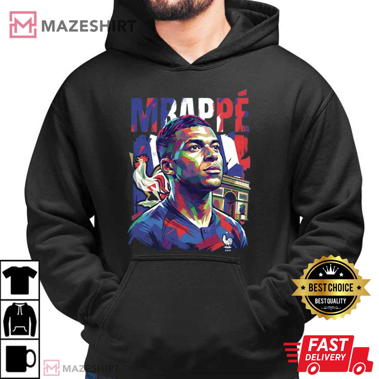 Mbappé is painted in bright pop art colors including reds, blues, and yellows in the middle of the picture. This demonstrates how aggressive he plays and how big he is. Little touches, like the French rooster and the buildings in Paris, give the design more depth and tie it to national pride and cultural identity.