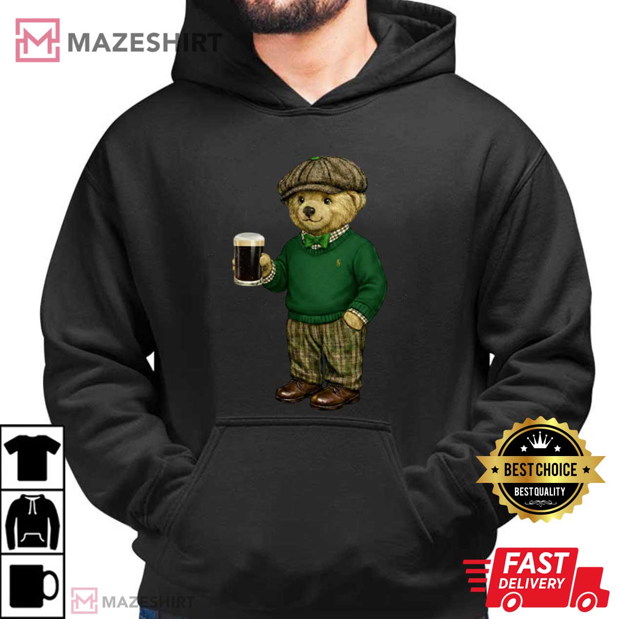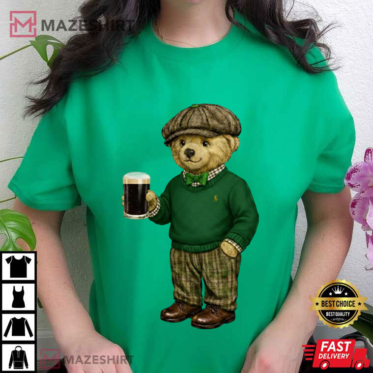 In the middle of the picture is a well-dressed teddy bear in typical Irish clothing: a tweed flat cap, a green sweater, plaid pants, and polished brown shoes. The bear is carrying a dark pint, which is probably a classic Irish stout. The complete appearance comes together with subtle shamrock details and deep green tones, which give it that unmistakable St. Patrick’s Day attitude.