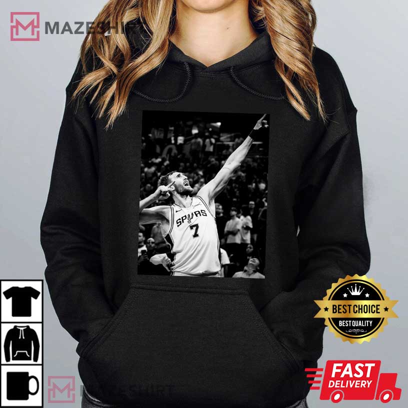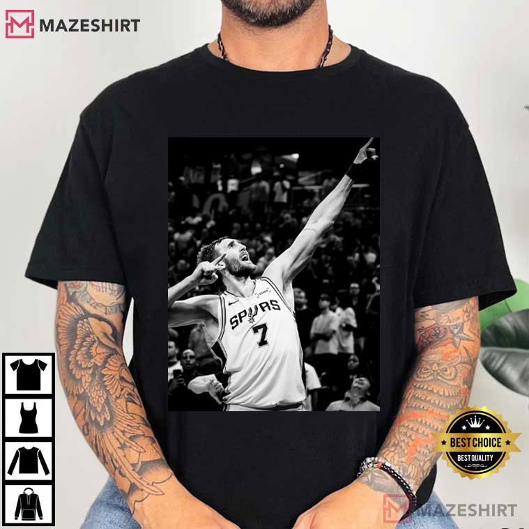 The black-and-white action shot puts all the focus on Luke Kornet’s body and feelings. His arm is lifted, the crowd is blurry, and the excitement is clear. It shows that he is a big man who works hard and offers effort, rim protection, and momentum plays when they are needed. The Spurs jersey in the picture ties it to San Antonio basketball culture, making this shirt a tribute to a specific time in Spurs history instead than just an NBA shirt.