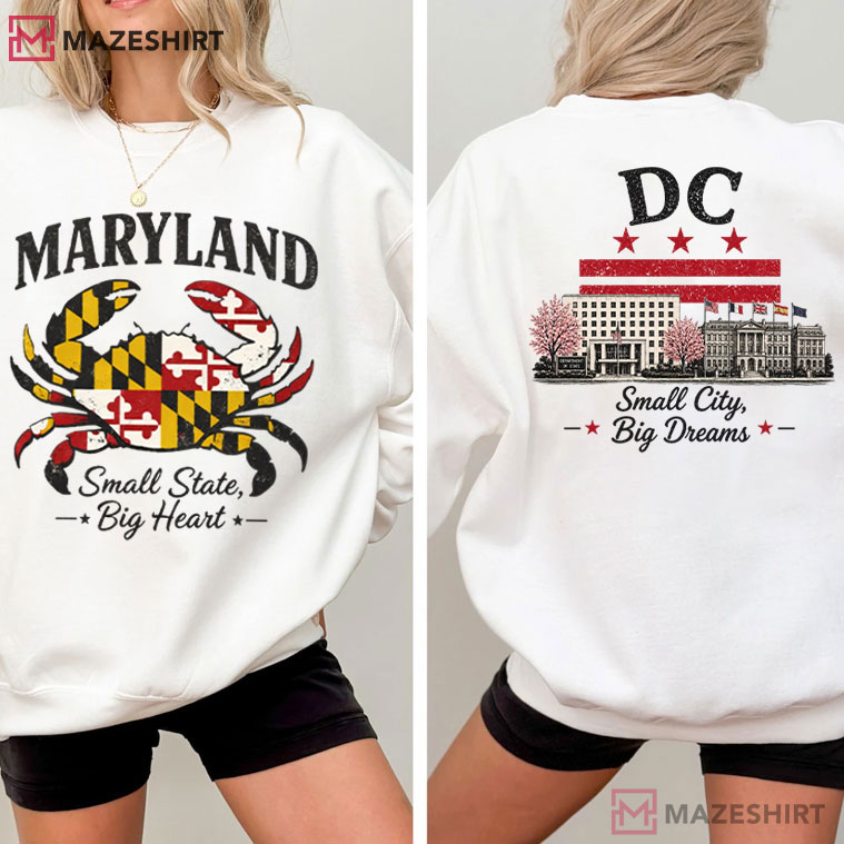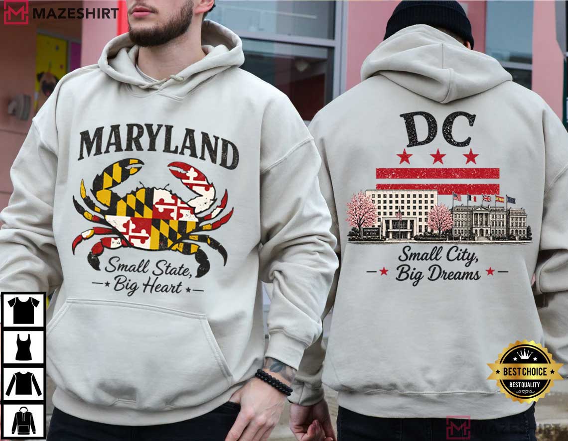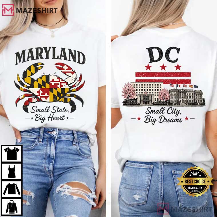 The Maryland Crab Washington DC Small City Big Dreams T-Shirt has a strong, two-sided graphic that honors the spirit of the Mid-Atlantic, where coastal culture meets big-city dreams. This shirt has a striking front-and-back design that unites Maryland pride and Washington, DC identity in a way that feels real, stylish, and very local.