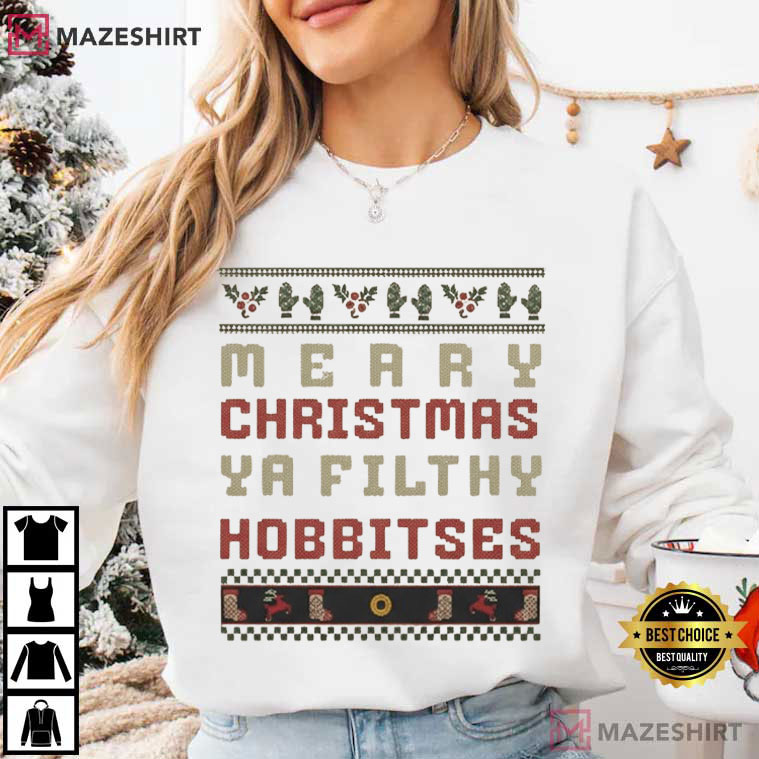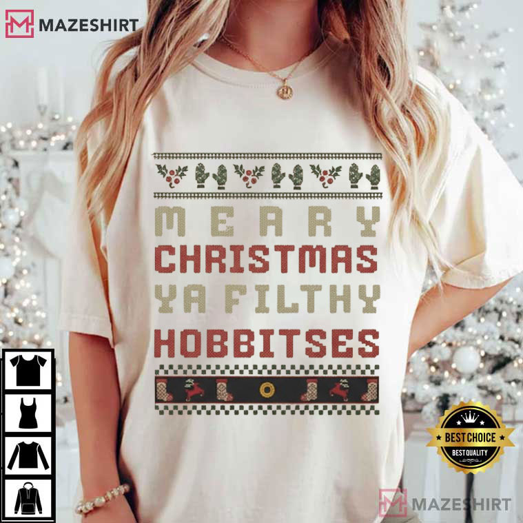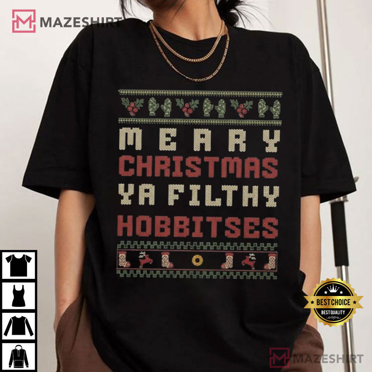 Merry Christmas The Ya Filthy Hobbitses Funny Gollum T-Shirt is the finest way to mix vintage festive enthusiasm with renowned fantasy humor. The design is based on the infamous character Gollum and has an ugly-sweater-style knit pattern with the famous slogan “Ya Filthy Hobbitses,” which aficionados of epic fantasy stories will recognize right away.