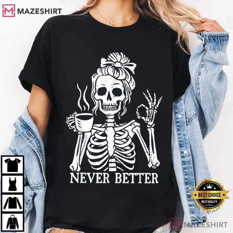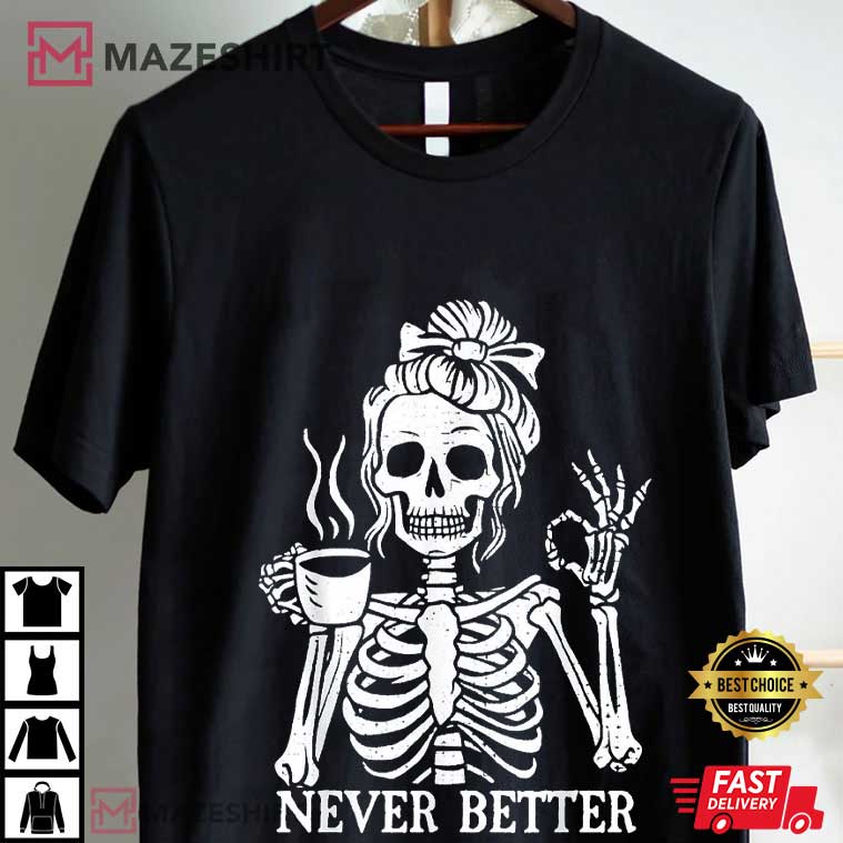 And just like that, the Messy Bun Drinking Coffee Never Better Skeleton Halloween T-Shirt was made. It’s the most brutally honest piece of clothing ever.