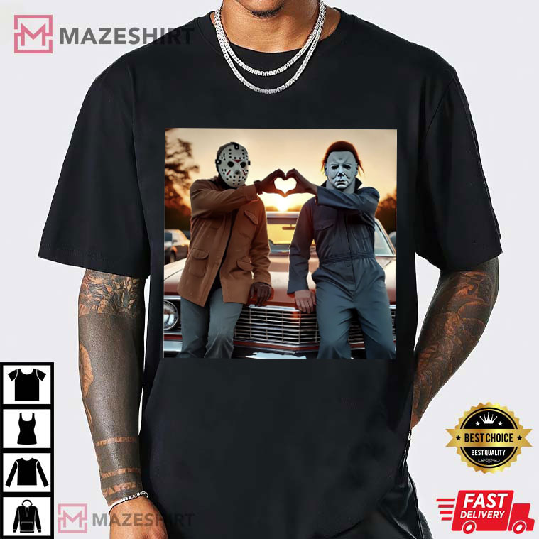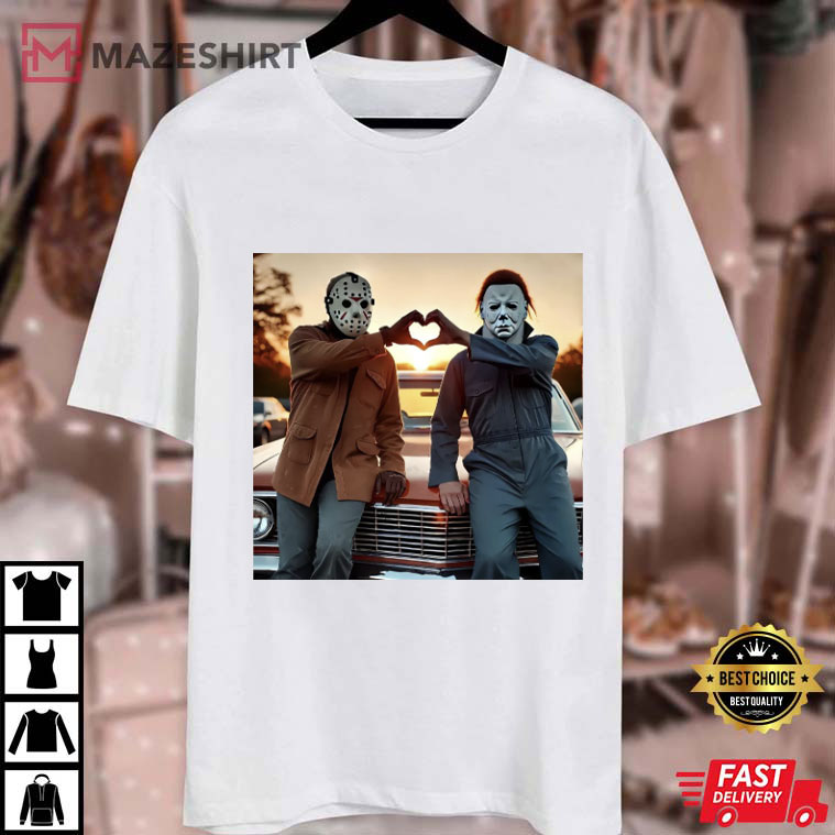 Hey, Halloween lovers and horror movie fans! The Michael And Jason Heart Hands Horror Movie Halloween T-Shirt is a shirt that is spooky, adorable, and just plain funny all at the same time. This Halloween T-Shirt features the famous Michael Myers and Jason Voorhees duo making a heart with their hands in front of a sunset. It’s the perfect way to add some spooky fun to your wardrobe. This shirt is perfect for Halloween or any time you want to look scary but also cute.