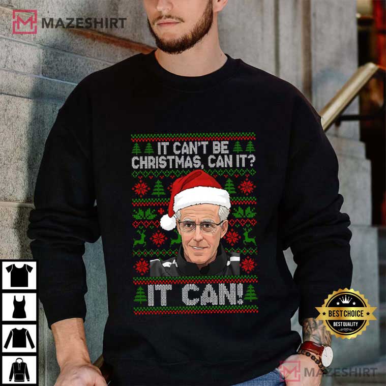 This Mick McCarthy It Can’t Be Christmas Can It Funny T-Shirt has football jokes, holiday jokes, and the distinct “ugly sweater” design that makes Christmas shirts so much fun. The design has a cartoon-style picture of a famous football manager wearing a Santa hat. The picture is surrounded by retro pixel-pattern visuals of trees, snowflakes, and reindeer.