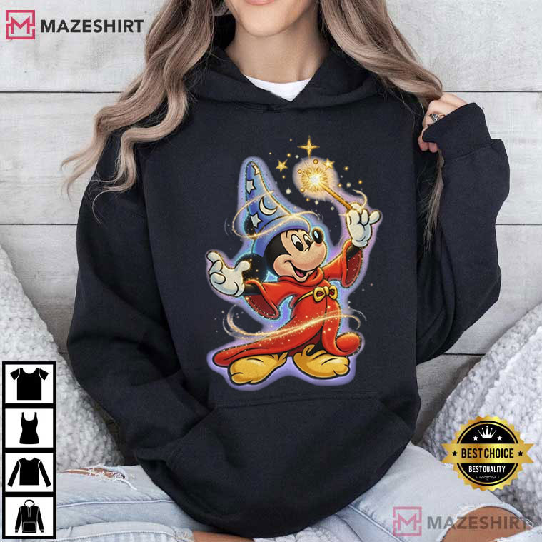The Mickey Fantasia Sorcerer Walt Disney T-Shirt honors one of the most famous scenes in the history of animation. This shirt is based on the famous sorcerer scene from Disney’s Fantasia. It shows Mickey Mouse casting spells with a luminous wand and a wizard hat full of stars.