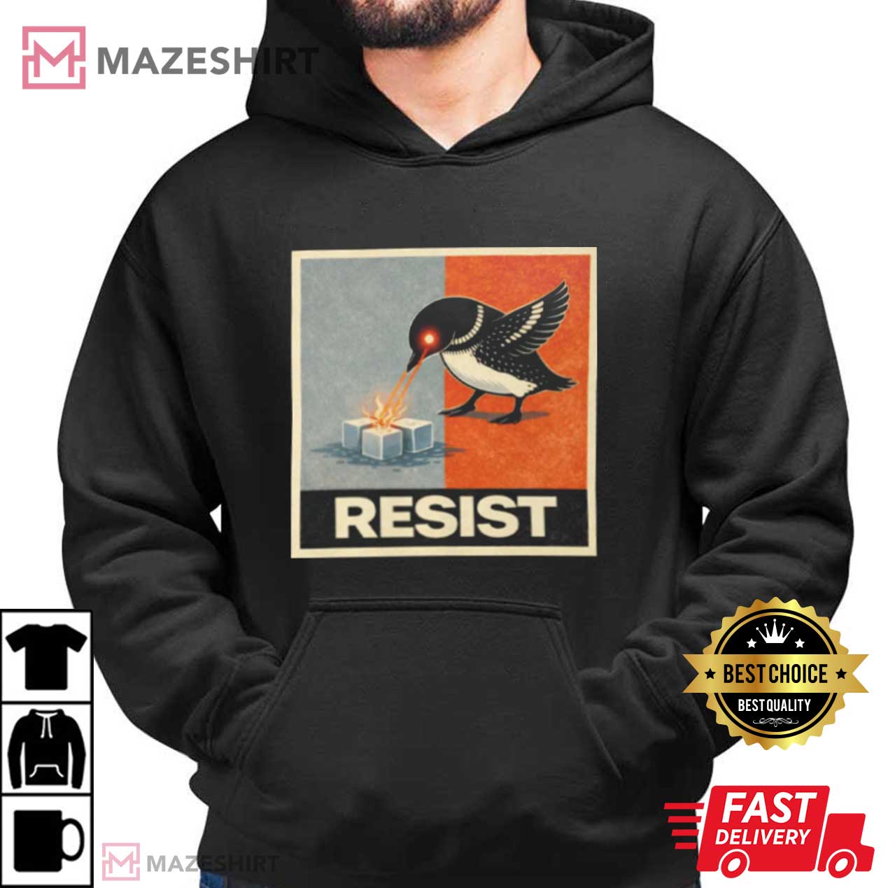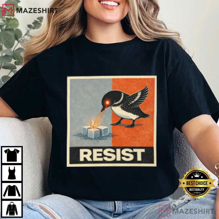 The Minneapolis Resist Laser Loon Activist T-Shirt makes a clear and strong statement about regional identity. There is a fascinating poster-style picture in the middle of the chest. It shows the loon, Minnesota’s state bird, with flashing eyes and a laser beam piercing through blocks of ice. One one word holds the message together: RESIST. Little text, big meaning.