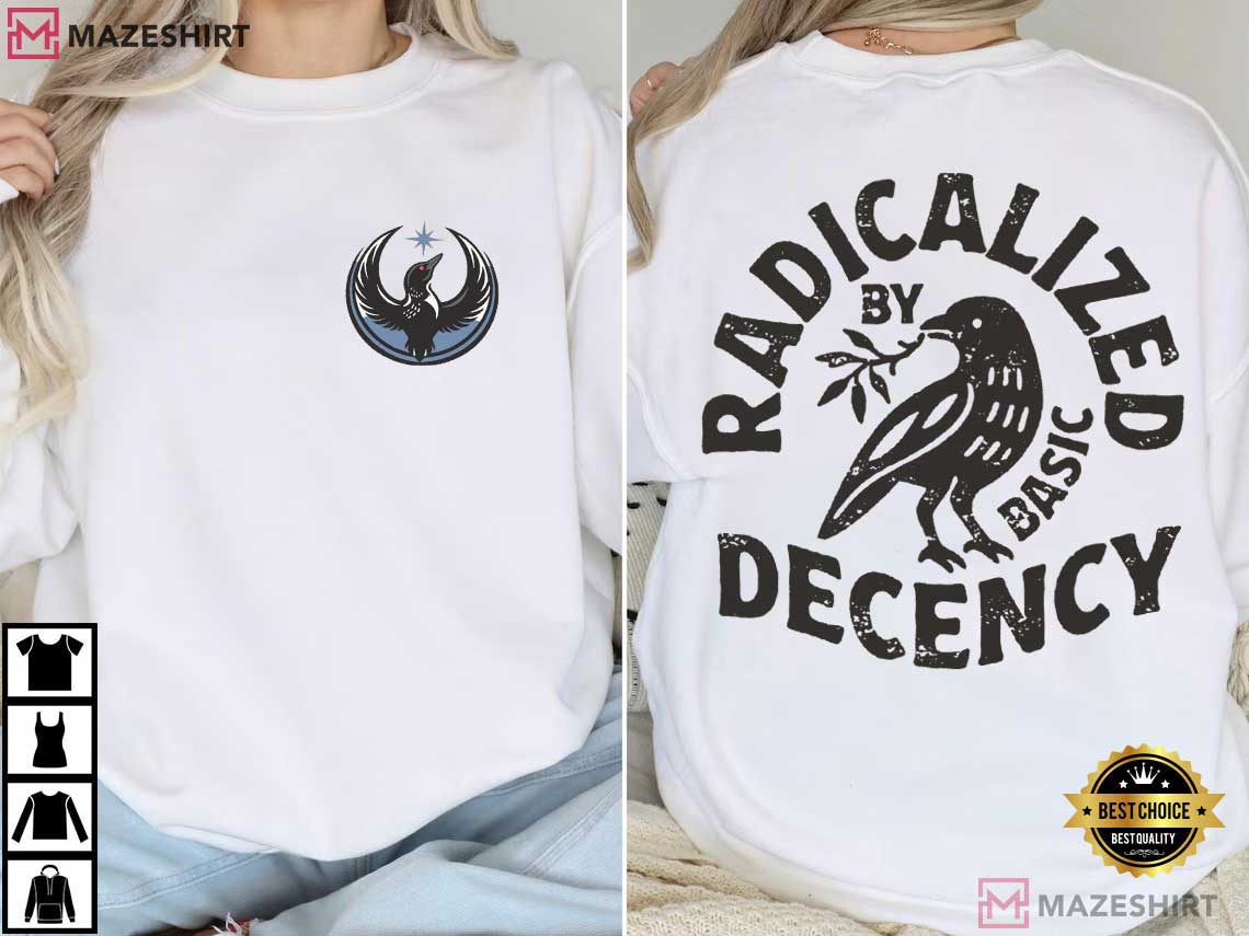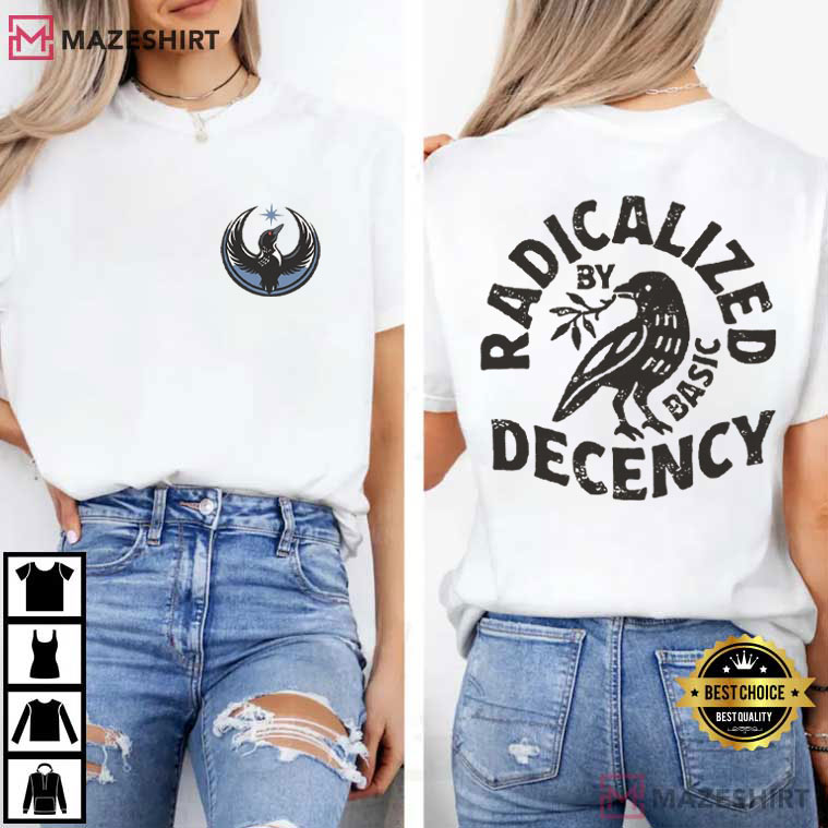 The Minnesota Rebel Political “Radicalized by Basic Decency” T-Shirt has a simple design that means a lot. This shirt isn’t just a piece of clothing; it’s a statement about honesty, compassion, and civic pride. It has a big image on the back that says “Radicalized by Basic Decency” around a bird holding an olive branch.