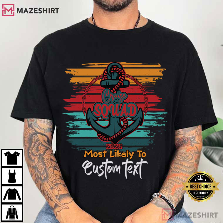 The Most Likely to Cruise Squad 2026 Custom T-Shirt is all about the fun times you have with your friends, the inside jokes you share, and the excitement you experience when you’re all counting down to vacation together. This shirt has a big nautical anchor, stripes that look like a sunset, and wording that you can change. It makes your cruise group look like a true team that you can spot right away from the pool deck to the streets of the port city.