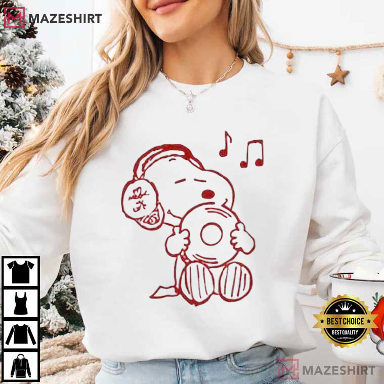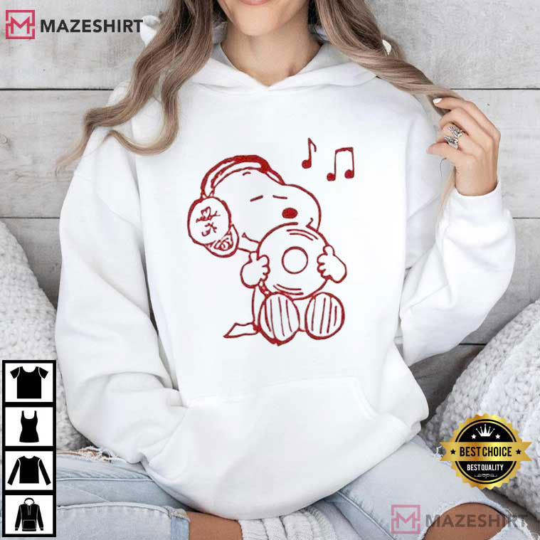 The Music Snoopy Peanuts Cartoon T-Shirt is a warm, feel-good ode to the simple love of music. This design has a cartoon beagle sitting comfortably with headphones and a vinyl record. It makes you think of the past, calm times, and the sense of getting lost in your favorite music.