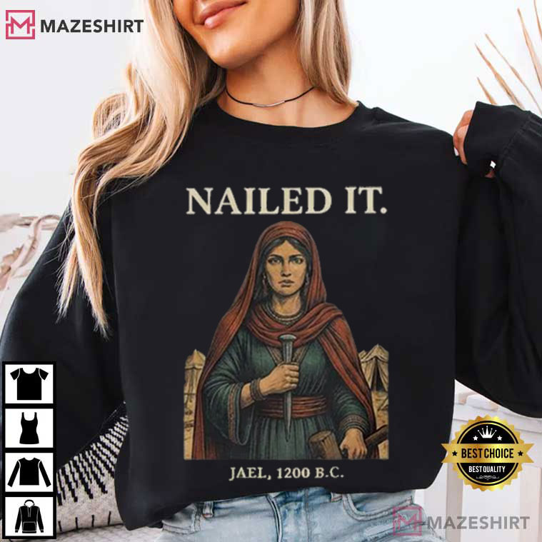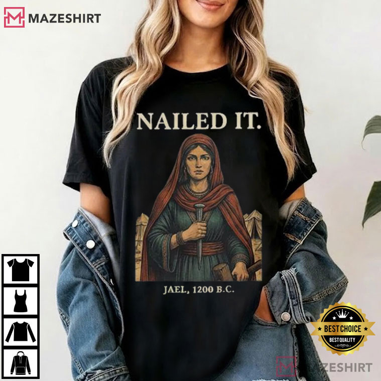 Jael, a character from the Book of Judges, is the main focus of the artwork. She is shown clutching a tent peg and looking calm, collected, and strong. The word “Nailed It” above her gives the punchline, while “Jael, 1200 B.C.” gives the design its historical context.
