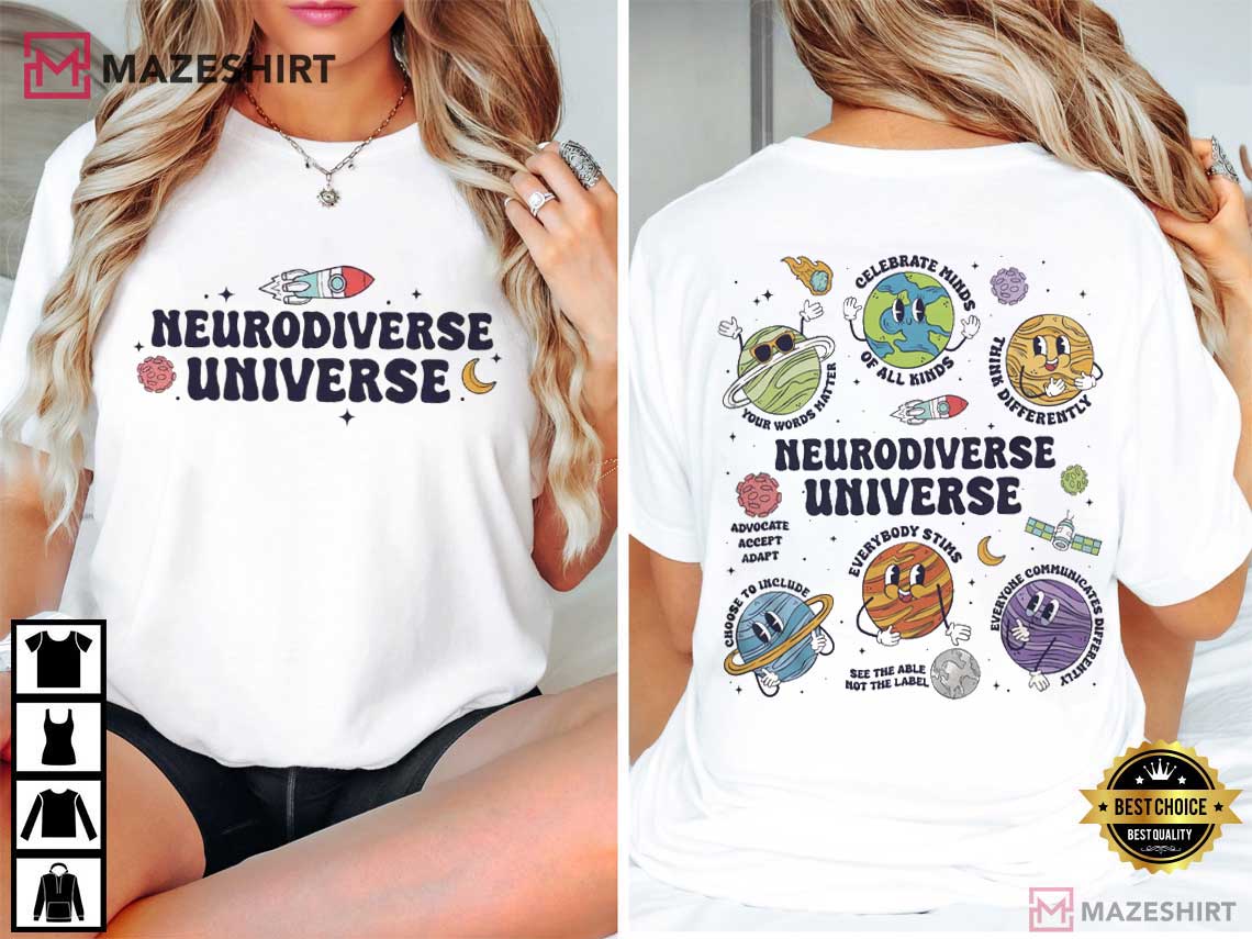 Enter a world where stars don’t fight each other; they work together. The Neurodiverse Universe Autism Awareness Space T-Shirt isn’t just a nice graphic tee; it’s a movement that will make you feel good and give you a cosmic dosage of kindness.