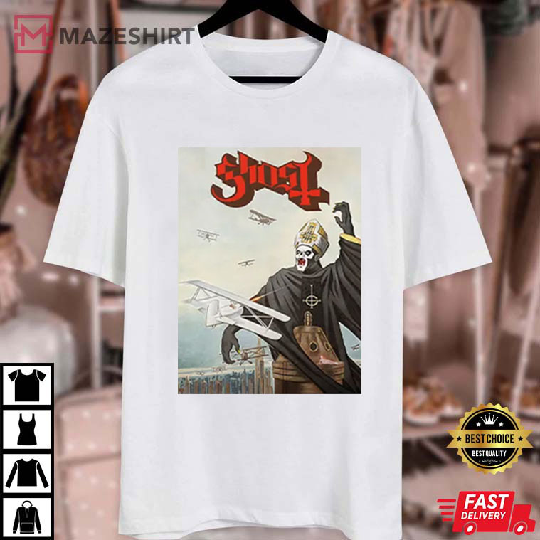 Hey there, people who like rocks and the occult! The Papa Emeritus Ghost Majesty T-Shirt is excellent for you if you want to convey some dark, theatrical sensations right from the stage. This pristine white tee has a cool graphic that comes straight from Ghost’s famous “Majesty” song artwork. It shows Papa Emeritus in all his scary magnificence.