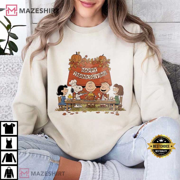 The Peanuts Snoopy Charlie Brown Thanksgiving Holiday T-Shirt will bring warmth, nostalgia, and fun to your outfit this holiday season. There are Snoopy, Charlie Brown, Lucy, Linus, and Peppermint Patty seated around a Thanksgiving table on this shirt. It captures the spirit of the season: family, friendship, and a little bit of fun. This shirt is great for family dinners, the Thanksgiving special, or just to demonstrate how much you love Charles Schulz’s iconic comic strip.