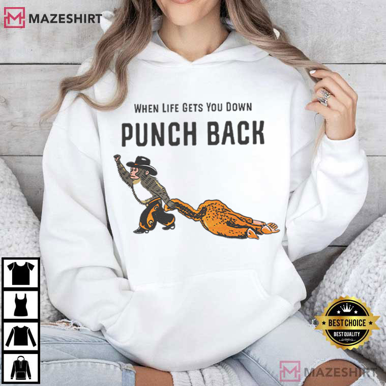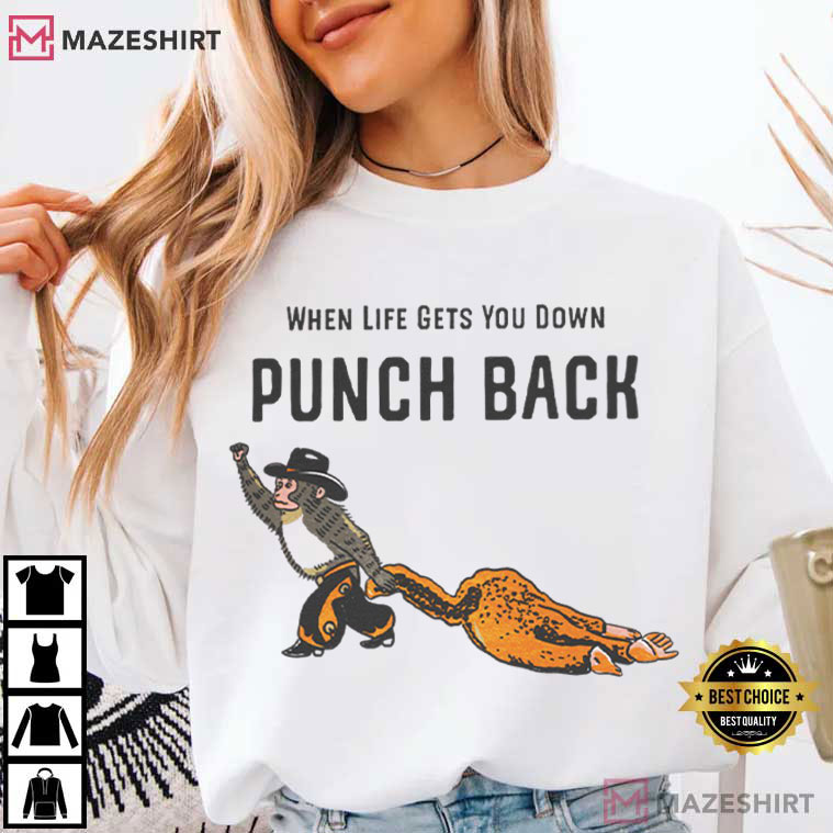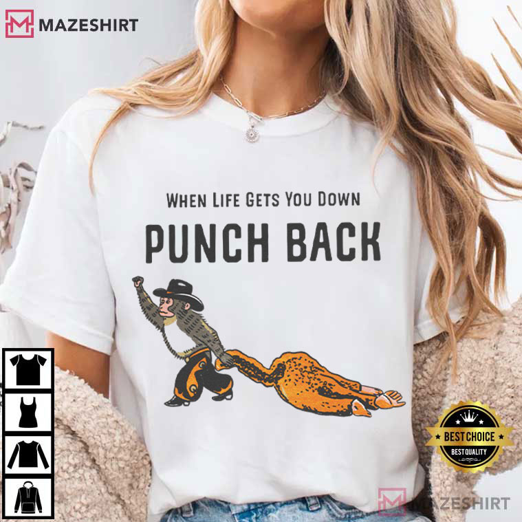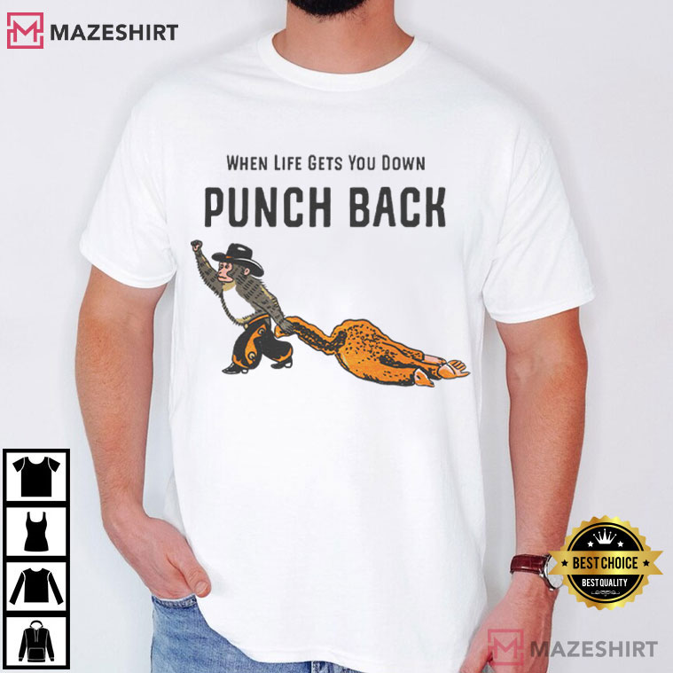This graphic shirt has a funny, tough monkey dressed as a cowboy and the bold statement “When Life Gets You Down—Punch Back.” The design is sure to catch your eye right away.