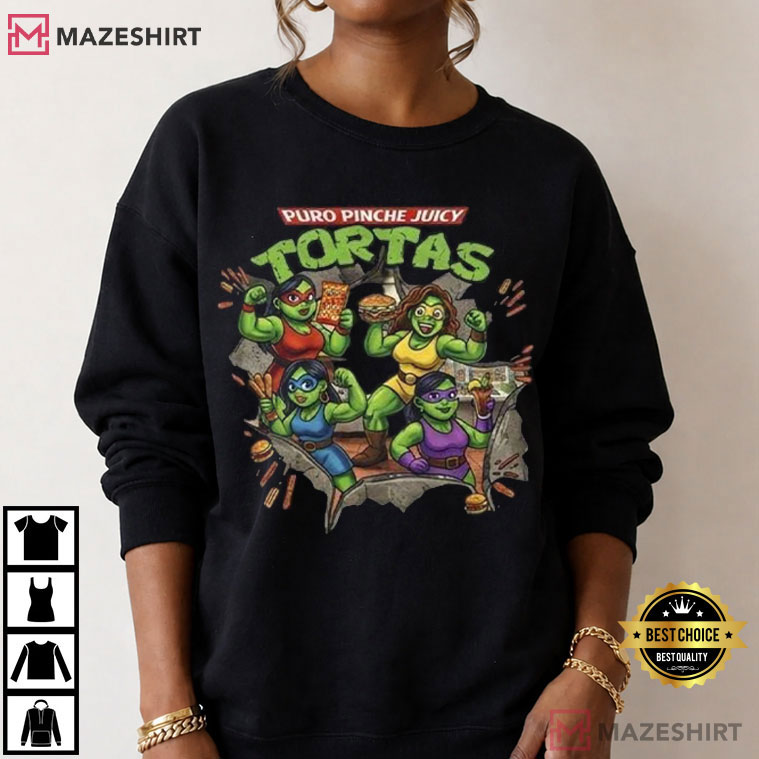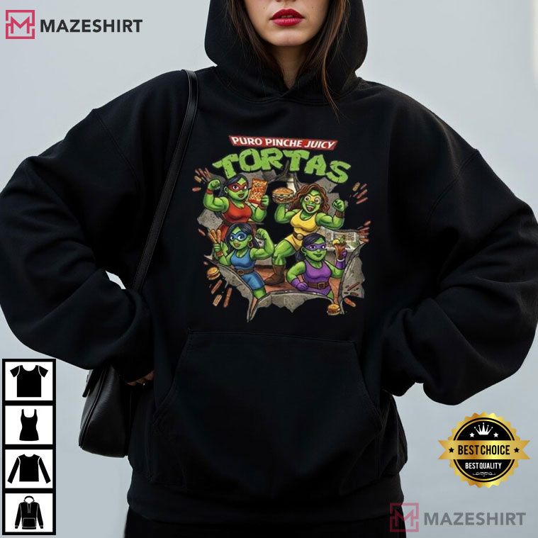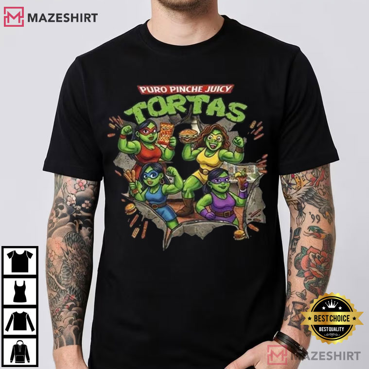 The Puro Pinche Juicy Tortas Funny Mexican-Themed T-Shirt is a bold, bright, and full of personality design that will catch people’s attention right away. It combines humor, food culture, and the joyful energy of pop art into one image that is both enjoyable and expressive.