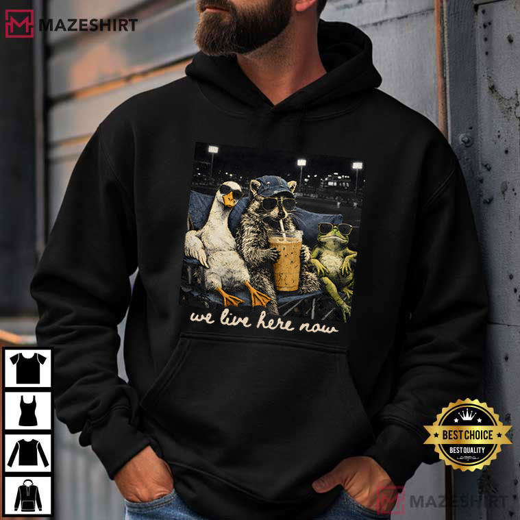 The Raccoon Goose Frog We Live Here Now Sports T-Shirt is one of those designs that makes you want to know more and laugh right away. This shirt has a relaxed raccoon, geese, and frog resting like VIPs at a stadium. It depicts that incomparable feeling of claiming your seat and owning it.