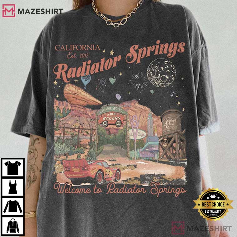People who like animated movies and nostalgic road trip stories will immediately see how charming Radiator Springs is. The Radiator Springs Lightning McQueen Disney Comfort Colors T-Shirt has a gorgeous design based on the world of Disney Pixar’s Cars that captures the spirit of that famous desert town. This shirt honors one of the most famous places in modern animated storytelling with warm desert colors, vintage-style writing, and the famous racing legend Lightning McQueen.