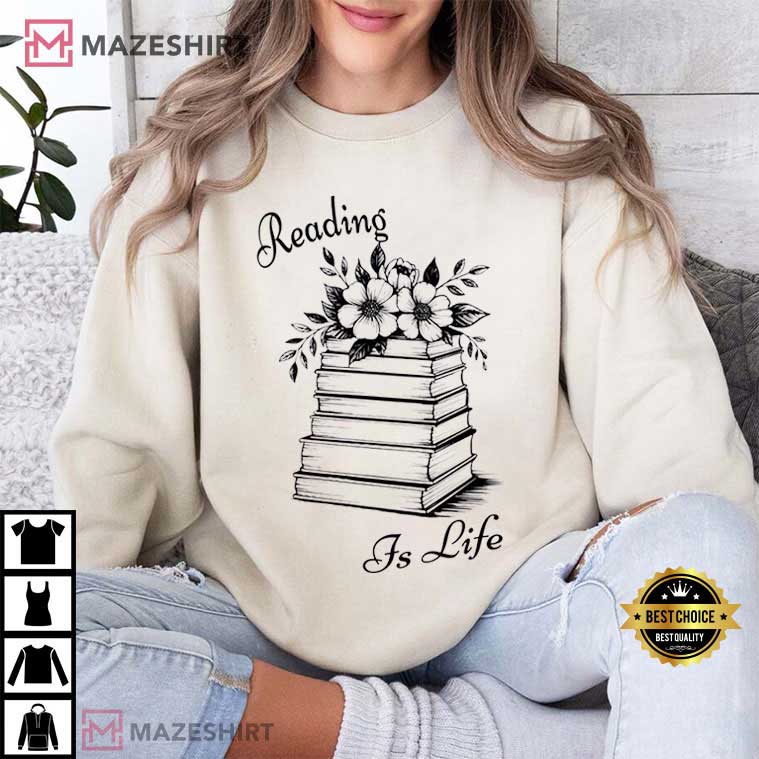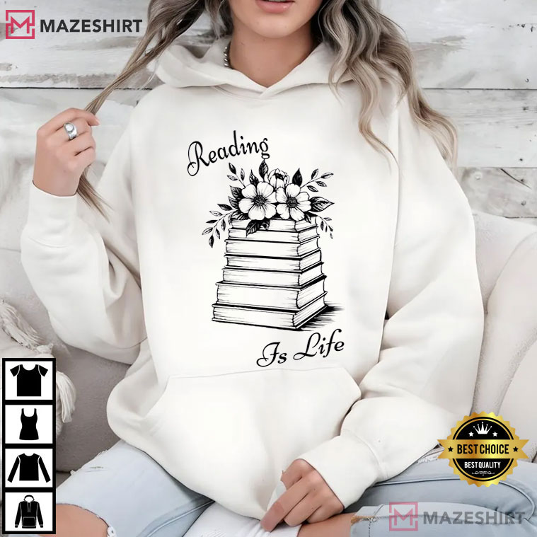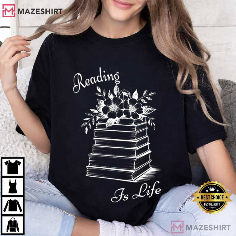 Reading Is Life Floral Book Stack T-Shirt – graphic tees men, graphic tees women, unique graphic t shirts