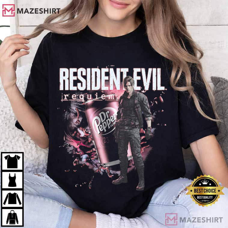 The Resident Evil Requiem Dr Pepper Collaboration Vintage T-Shirt is a cool mix of gloomy gaming style and surprising pop culture style. This design takes a gritty, stylized look at horror and adds a startling twist. It features the famous Leon S. Kennedy from the Resident Evil series.